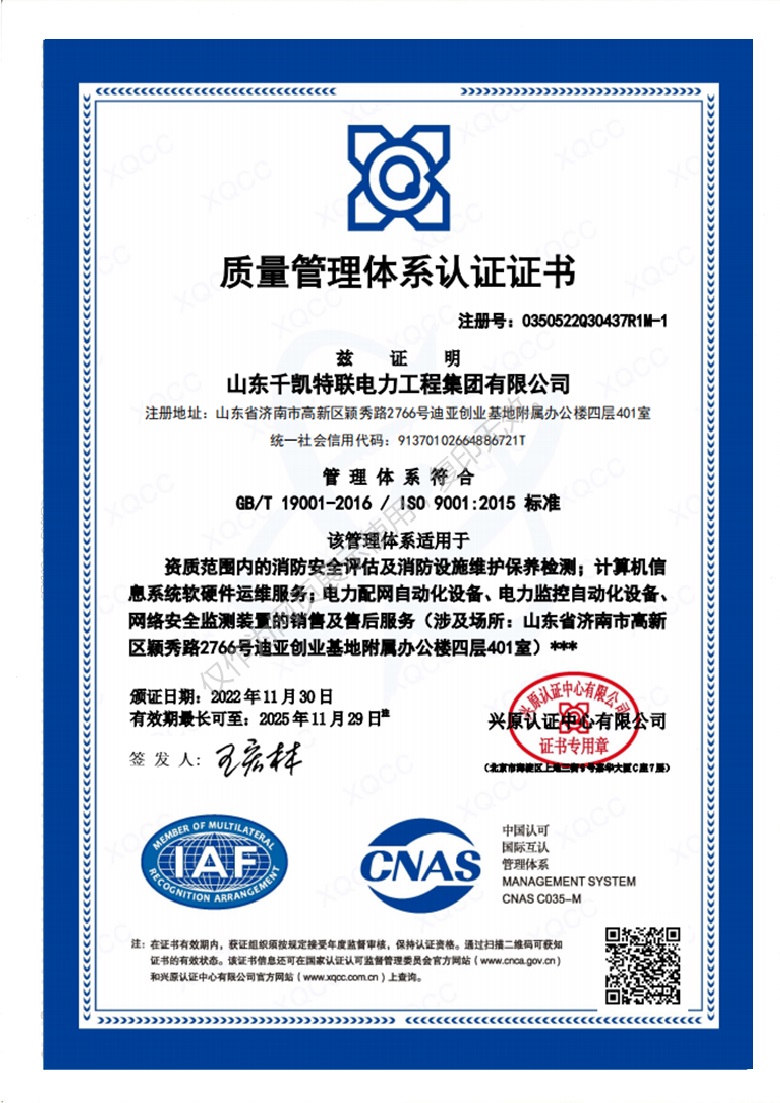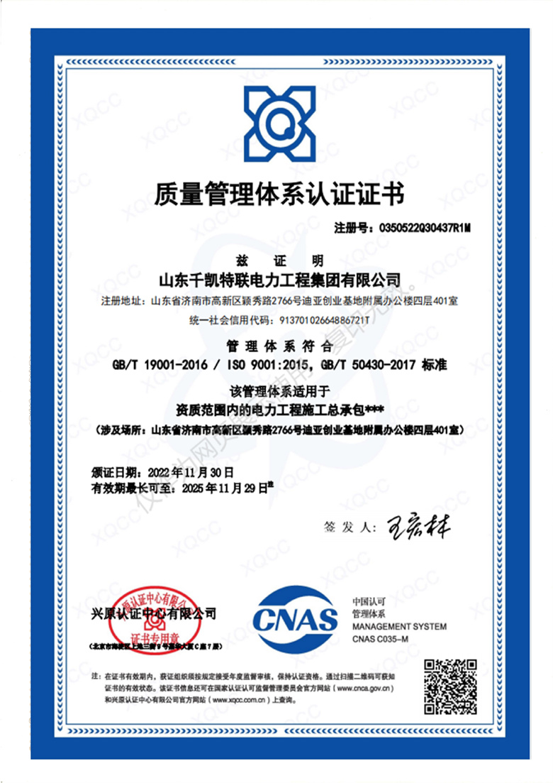 ISO9001質(zhì)量管理體系證書(shū)(電力施工)