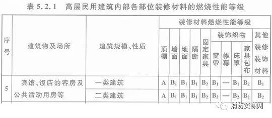 二、高層旅館建筑內(nèi)部各部位裝修材料的燃燒性能等級(jí),不應(yīng)低于《建筑內(nèi)部裝修設(shè)計(jì)防火規(guī)范》5.2.1規(guī)定: