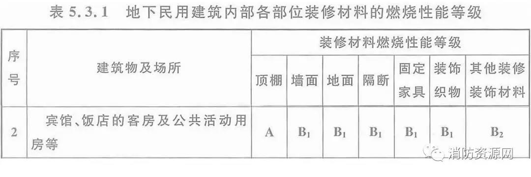 三、地下旅館建筑內(nèi)部各部位裝修材料的燃燒性能等級(jí),不應(yīng)低于《建筑內(nèi)部裝修設(shè)計(jì)防火規(guī)范》5.3.1規(guī)定: