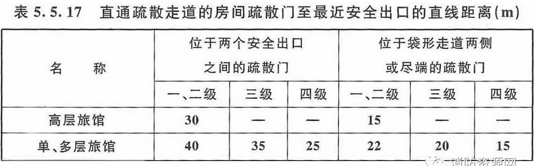旅館建筑直通疏散走道的房間疏散門至最近安全出口的直線距離不應(yīng)大于《建規(guī)》 5.5.17 規(guī)定(下表供參考,備注要求見表 5.5.17 ):