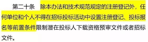 其實,在此之前,國家發(fā)改委和住建部等八部委公布的第20號令《電子招標投標辦法》中,就明確規(guī)定:除本辦法和技術規(guī)范規(guī)定的注冊登記外,任何單位和個人不得在招標投標活動中設置注冊登記、投標報名等前置條件,限制潛在投標人下載資格預審文件或者招標文件。
