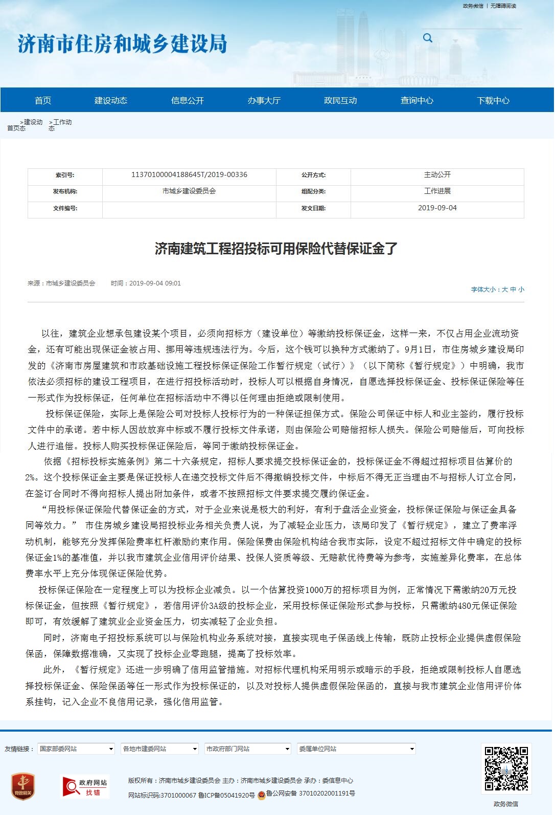 以往,建筑企業(yè)想承包建設(shè)某個項目,必須向招標方(建設(shè)單位)等繳納投標保證金,這樣一來,不僅占用企業(yè)流動資金,還有可能出現(xiàn)保證金被占用、挪用等違規(guī)違法行為。今后,這個錢可以換種方式繳納了。9月1日,市住房城鄉(xiāng)建設(shè)局印發(fā)的《濟南市房屋建筑和市政基礎(chǔ)設(shè)施工程投標保證保險工作暫行規(guī)定(試行)》(以下簡稱《暫行規(guī)定》)中明確,我市依法必須招標的建設(shè)工程項目,在進行招投標活動時,投標人可以根據(jù)自身情況,自愿選擇投標保證金、投標保證保險等任一形式作為投標保證,任何單位在招標活動中不得以任何理由拒絕或限制使用。
