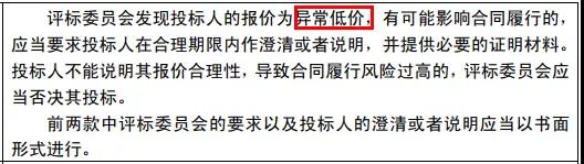 發(fā)現(xiàn)投標(biāo)人的報(bào)價(jià)為異常低價(jià),有可能影響合同履行的,應(yīng)當(dāng)要求投標(biāo)人在合理期限內(nèi)作澄清或者說(shuō)明,并提供必要的證明材料。不能說(shuō)明其報(bào)價(jià)合理性,導(dǎo)致合同履行風(fēng)險(xiǎn)過(guò)高的,應(yīng)當(dāng)否決其投標(biāo)。