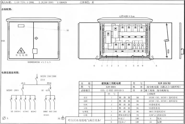 內設200A-250A具有隔離功能的DZ20系列透明塑殼斷路器作為主開關(與總配電箱分路設置斷路器相適應);采用DZ20或 KDM-1型透明塑殼斷路器作為動力分路、照明分路控制開關;各配電回路采用DZ20或KDM-1透明塑殼斷路器作為控制開關;PE線連線螺栓、N線接線螺栓根據實際需要配置。