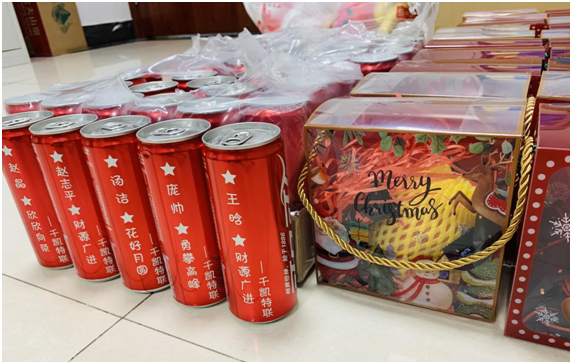 恰逢圣誕節(jié)來臨之際,公司還為每個人準備了定制的可樂祝福和圣誕禮物??粗麄冮_心的笑容和餐桌上色香味俱全的。