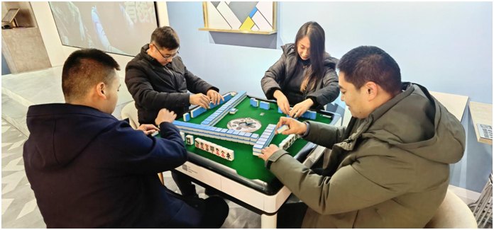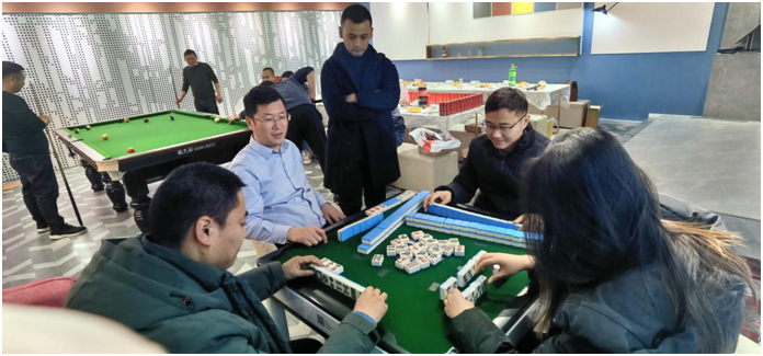 東南西北中發(fā)白,三個小幺都到來。四人一桌,玩的不亦樂乎,不時傳來“胡了、胡了”的興奮聲音,真真是麻將狂熱愛好者。