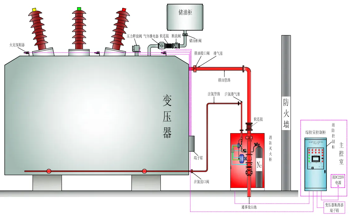 排油注氮裝置是專門用于油浸變壓器防護和滅火的一種新型消防設(shè)施。它具有自動探側(cè)變壓器火災、自動(或手動)啟動、控制排油閥開啟排油泄壓,同時斷流閥能有效阻止儲油柜至油箱的油路,并控制氮氣釋放閥開啟向變壓器內(nèi)注入氮氣等功能。該裝置的應用,彌補了水噴霧滅火系統(tǒng)及其他滅火系統(tǒng)不能預防變壓器火災的不足,并具有經(jīng)濟、有效、方便、適用等突出特點,已成為替代其他滅火設(shè)施的重要裝置,在供電企業(yè)中得到廣泛使用。