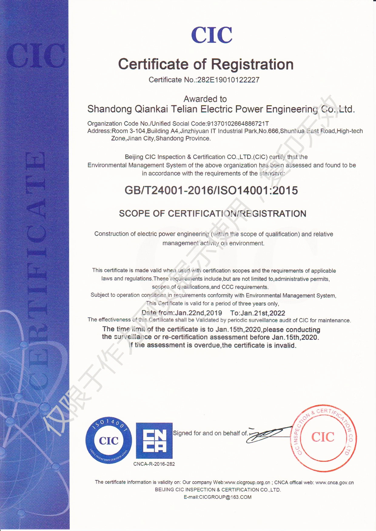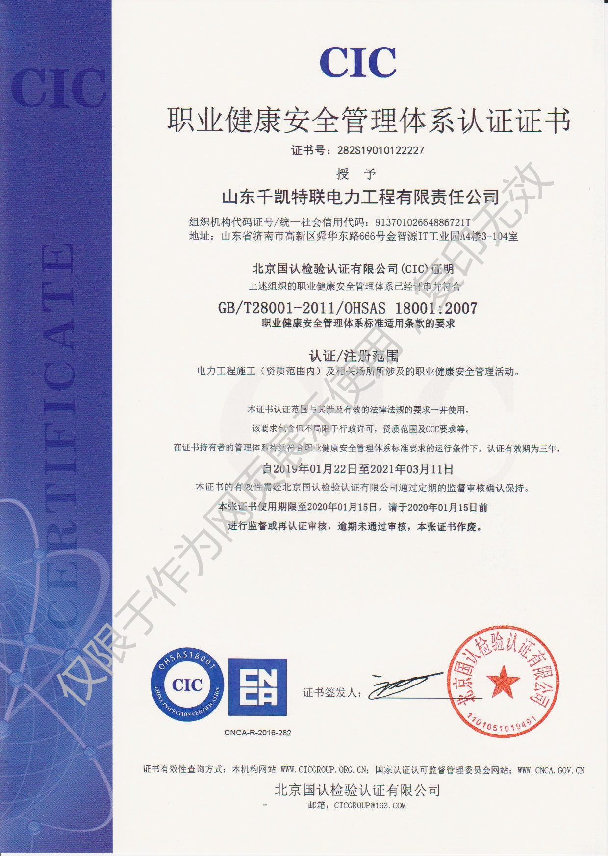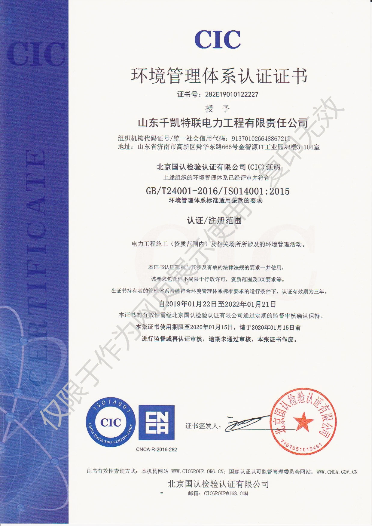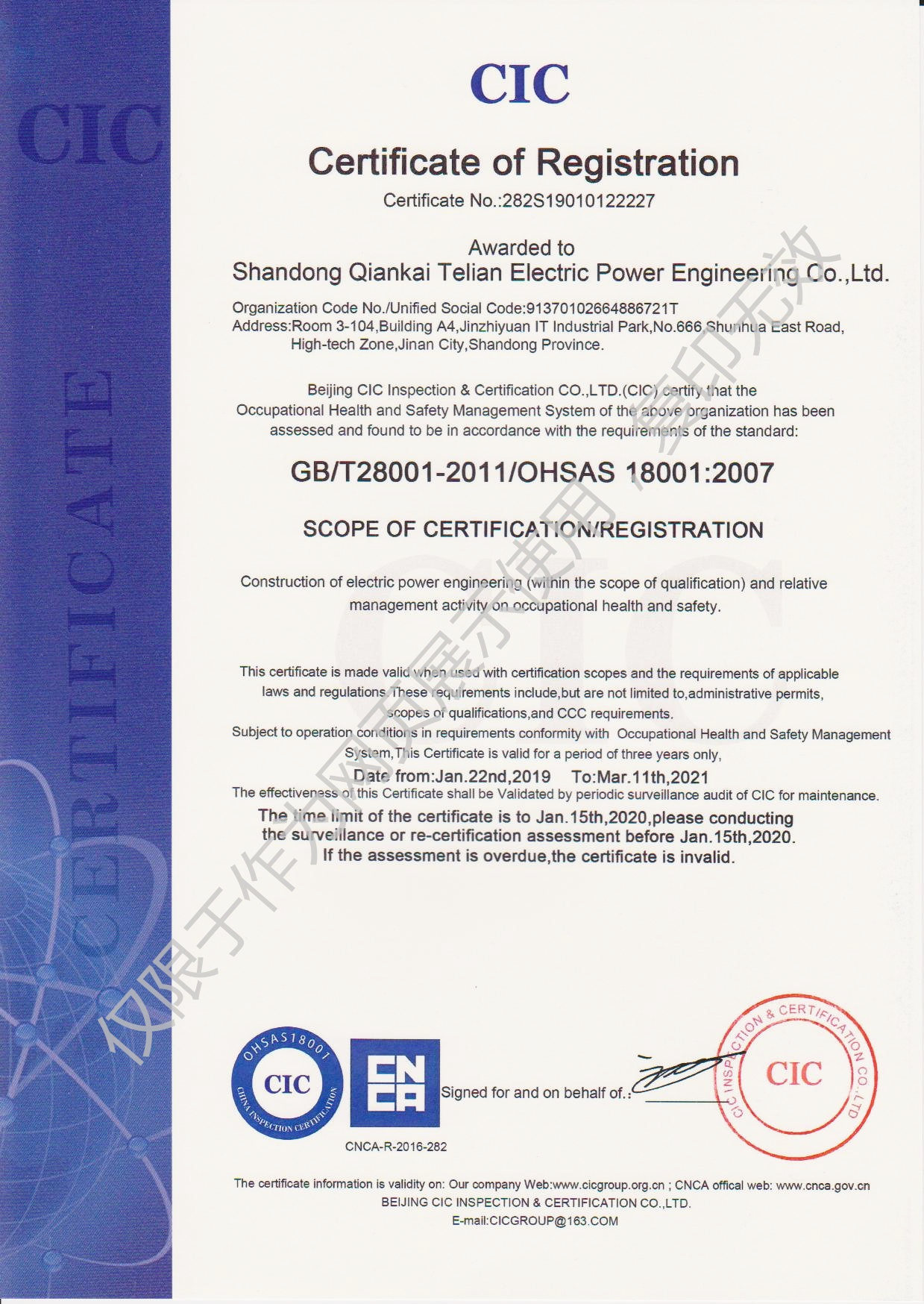 2019年1月22日,山東千凱特聯(lián)電力工程有限責任公司順利通過ISO14001環(huán)境管理體系認證和OHSAS18001職業(yè)健康安全管理體系認證并取得證書。加上之前取得的ISO9001質(zhì)量管理體系證書,三大體系證書的取得是公司各項管理工作的規(guī)范化、標準化的全面檢測。我們將進一步優(yōu)化和規(guī)范各項管理制度,不斷提高體系運行的有效性,不斷提高公司的管理水平,共同推進公司的快速發(fā)展。